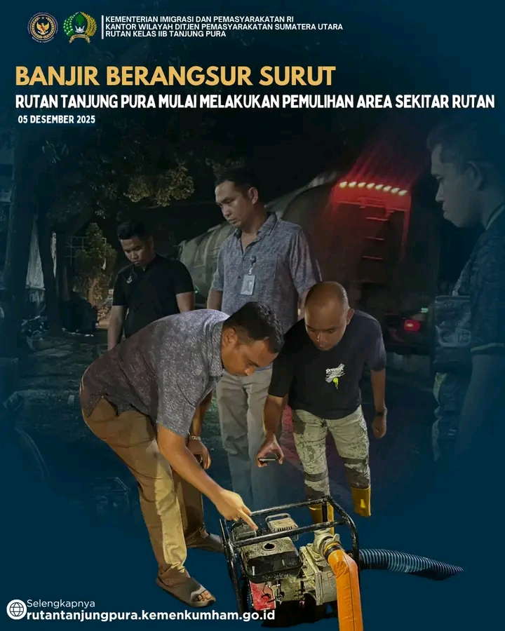 TIMELINES INEWS INVESTIGASI, Tanjung Pura Banjir yang sempat menggenangi area Rutan Kelas IIB Tanjung Pura kini mulai berangsur surut. Kondisi tersebut memberikan ruang bagi pihak Rutan untuk segera melakukan langkah pemulihan lingkungan secara menyeluruh. Meskipun sebagian besar air telah menurun, sejumlah titik masih menyisakan genangan yang berpotensi menghambat aktivitas dan keselamatan di lingkungan Rutan.
