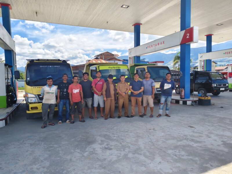 Syamsul Bahri S.Pd M.Ap kadis perdagangan koperasi dan Ukm Gayo Lues, Arwinsah,S.E Kabag ekonomi Setda Kab Gayo Lues, bersama Ketua Asisiasi Dumptruck Sukri pada saat menurunkan BBM di salah satu SPBU Gayo Lues