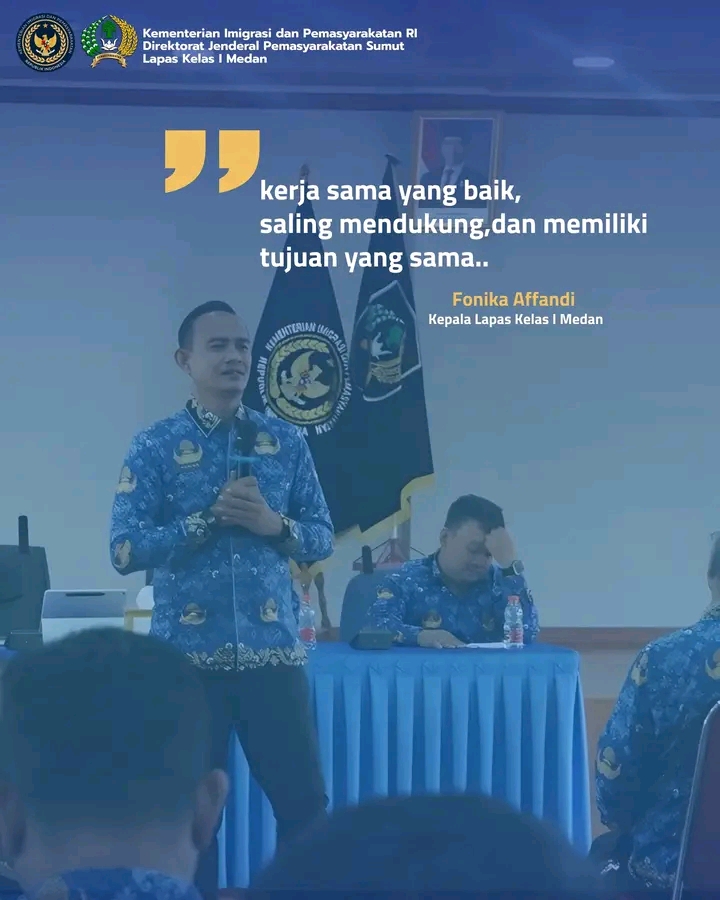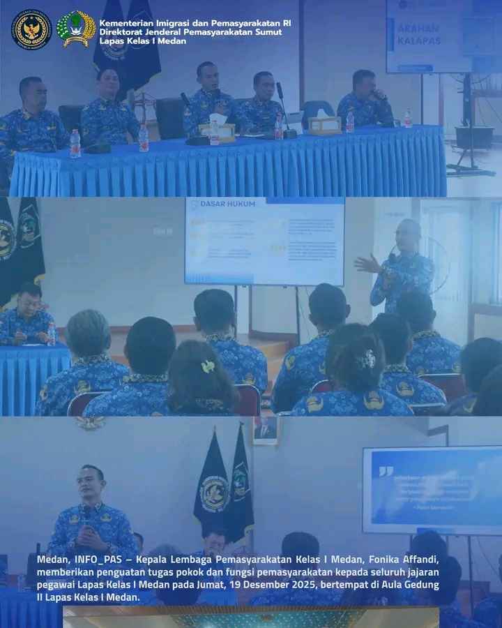 TIMELINES INEWS INVESTIGASI, Medan, Kepala Lembaga Pemasyarakatan Kelas I Medan, Fonika Affandi, memberikan penguatan tugas pokok dan fungsi pemasyarakatan kepada seluruh jajaran pegawai Lapas Kelas I Medan pada Jumat, 19 Desember 2025, bertempat di Aula Gedung II Lapas Kelas I Medan.