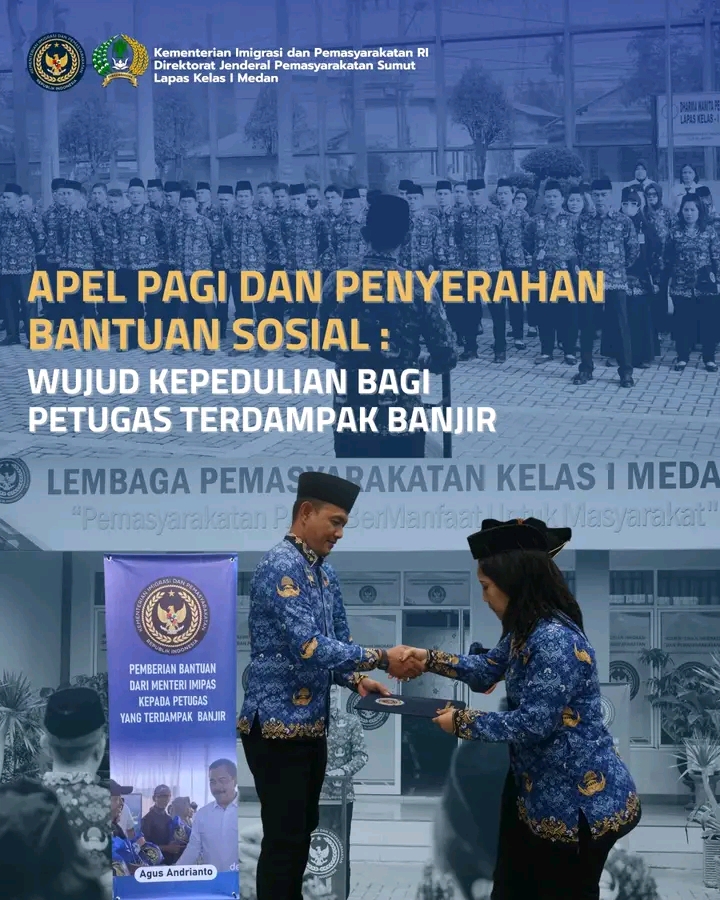 Apel pagi berlangsung dengan tertib di lingkungan Lapas Kelas I Medan dan diikuti oleh seluruh jajaran pegawai. Dalam kesempatan tersebut, Kalapas Kelas I Medan juga secara simbolis menyerahkan bantuan sosial kepada petugas yang mengalami dampak langsung akibat bencana banjir sebagai bentuk kepedulian dan perhatian pimpinan terhadap kesejahteraan pegawai.