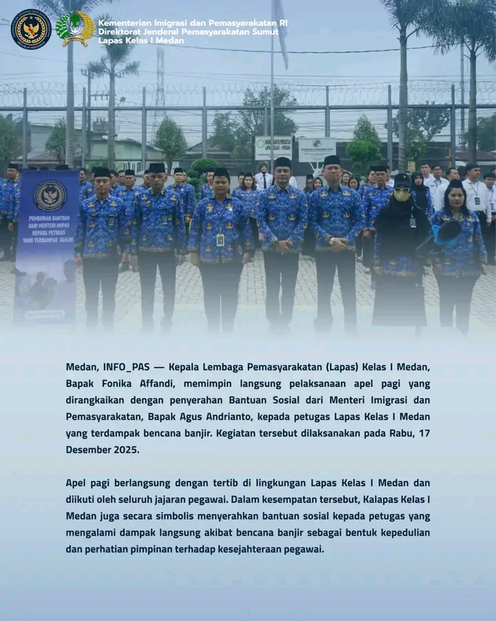 TIMELINES INEWS INVESTIGASI, Medan, Kepala Lembaga Pemasyarakatan (Lapas) Kelas I Medan, Bapak Fonika Affandi, memimpin langsung pelaksanaan apel pagi yang dirangkaikan dengan penyerahan Bantuan Sosial dari Menteri Imigrasi dan Pemasyarakatan, Bapak Agus Andrianto, kepada petugas Lapas Kelas I Medan yang terdampak bencana banjir. Kegiatan tersebut dilaksanakan pada Rabu, 17 Desember 2025.
