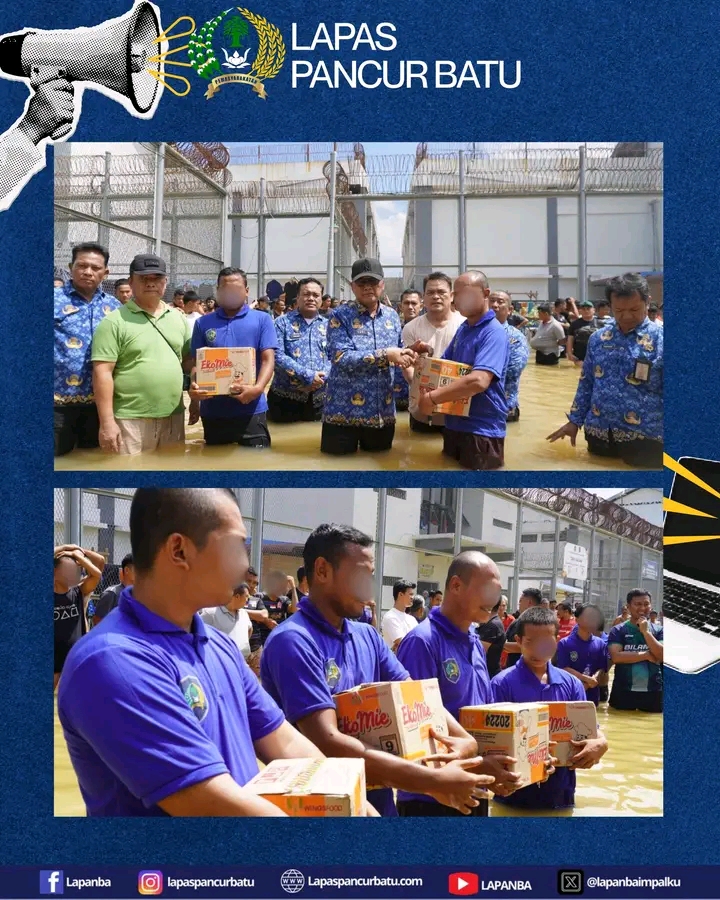 Pada kesempatan yang sama, Kalapas Pancur Batu turut menyerahkan bantuan sosial langsung berupa beras, mie instan, air minum, dan telur untuk membantu memenuhi kebutuhan warga binaan maupun petugas, mengingat akses logistik di sekitar lokasi masih terbatas akibat banjir yang belum surut.