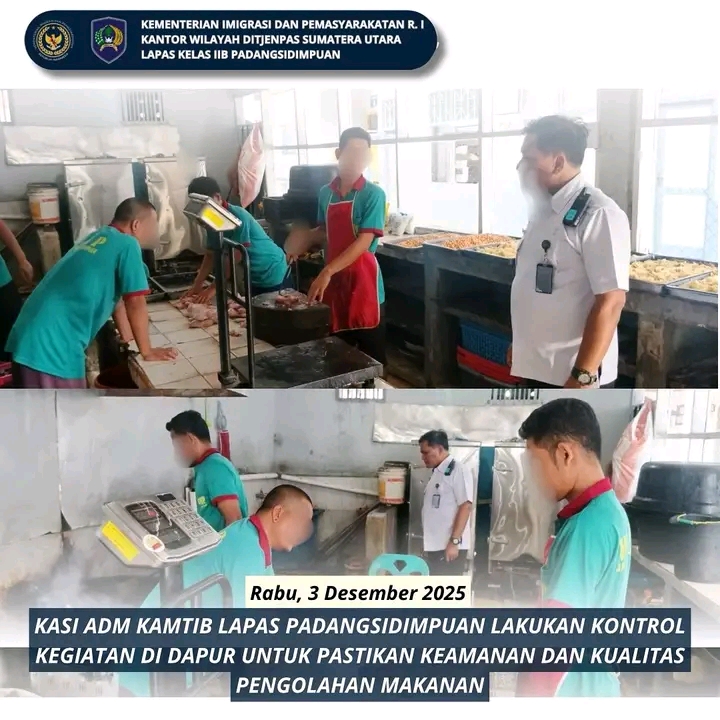 TIMELINES INEWS INVESTIGASI, Padangsidimpuan Kepala Seksi Administrasi Keamanan dan Ketertiban (Kasi Adm Kamtib) Lembaga Pemasyarakatan Kelas IIB Padangsidimpuan, Ambri, melakukan kontrol langsung ke area dapur Lapas pada Rabu (3/12/2025). Kegiatan ini merupakan langkah rutin dalam memastikan keamanan, ketertiban, serta kualitas pengolahan makanan bagi warga binaan.