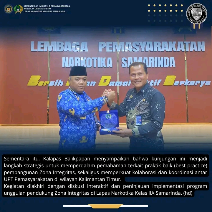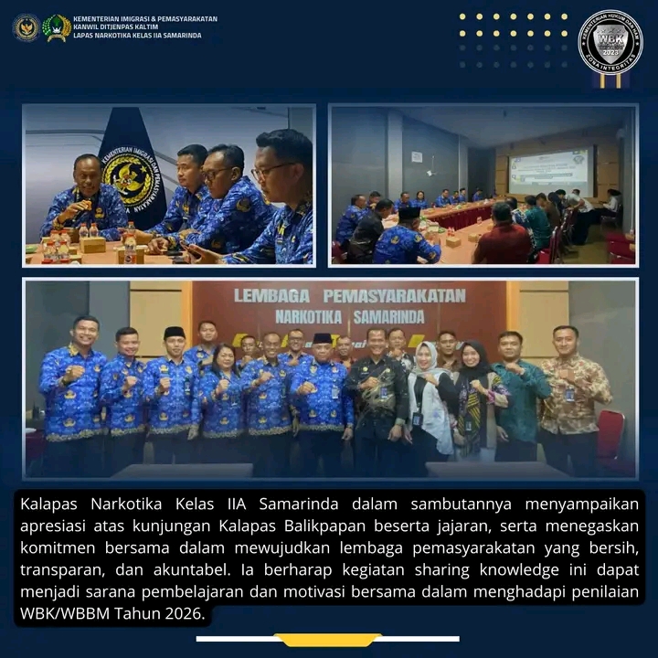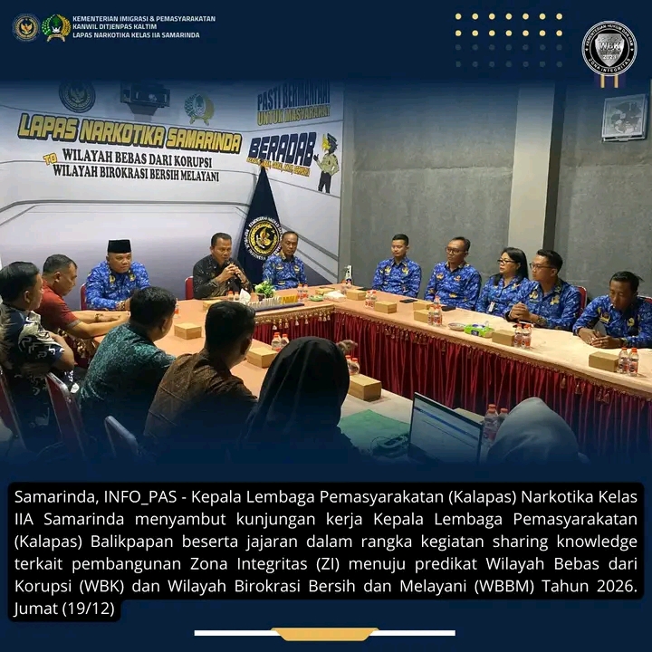 TIMELINES INEWS INVESTIGASI, Samarinda, Kepala Lembaga Pemasyarakatan (Kalapas) Narkotika Kelas IIA Samarinda menyambut kunjungan kerja Kepala Lembaga Pemasyarakatan (Kalapas) Balikpapan beserta jajaran dalam rangka kegiatan sharing knowledge terkait pembangunan Zona Integritas (ZI) menuju predikat Wilayah Bebas dari Korupsi (WBK) dan Wilayah Birokrasi Bersih dan Melayani (WBBM) Tahun 2026. Jumat (19/12)