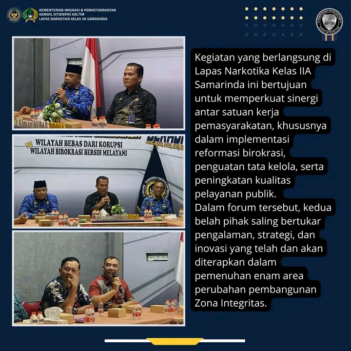 Kegiatan yang berlangsung di Lapas Narkotika Kelas IIA Samarinda ini bertujuan untuk memperkuat sinergi antar satuan kerja pemasyarakatan, khususnya dalam implementasi reformasi birokrasi, penguatan tata kelola, serta peningkatan kualitas pelayanan publik.