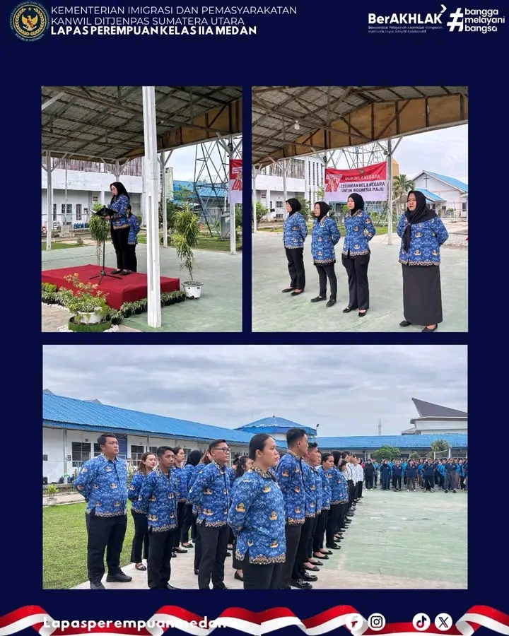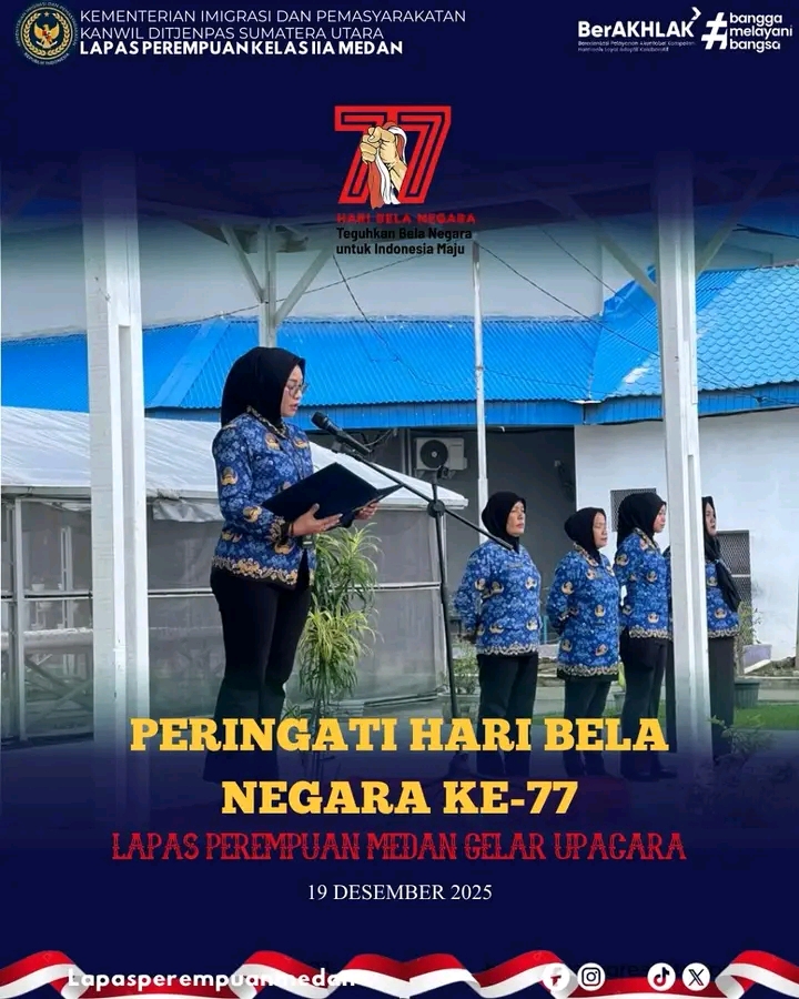 TIMELINES INEWS INVESTIGASI, Medan Lembaga Pemasyarakatan (Lapas) Perempuan Kelas IIA Medan gelar Upacara Peringatan Hari Bela Negara ke-77 Tahun 2025 yang diikuti oleh jajaran pejabat struktural, para pegawai dan Warga Binaan, Jum’at (19/12/25) di Lapangan upacara Laperdan. Upacara bertema “Teguhkan Bela Negara untuk Indonesia Maju”