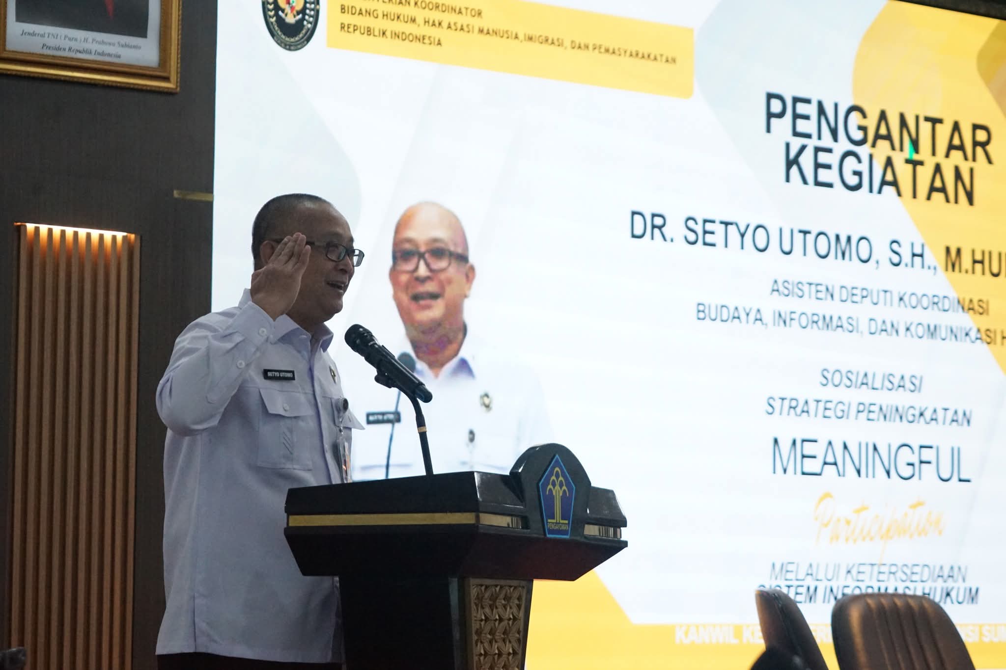 Acara dibuka oleh Asisten Deputi Koordinasi Budaya, Informasi, dan Komunikasi Hukum, Setyo Utomo, yang menekankan urgensi memperkuat partisipasi masyarakat secara bermakna dalam penyusunan produk hukum daerah. Menurutnya, peningkatan kualitas regulasi di daerah harus dilakukan melalui penguatan sistem informasi hukum, peningkatan kapasitas perangkat daerah, serta kolaborasi multipihak guna menghasilkan regulasi yang inklusif, adaptif, dan responsif terhadap kebutuhan publik.