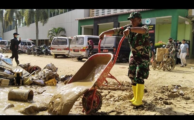 Puluhan personel TNI dari Kodim 0104/Atim dan Yonif TP 853/BRB bersama pihak rumah sakit, relawan, serta masyarakat setempat bahu-membahu membersihkan lumpur, sampah, dan sisa material banjir yang mengganggu aktivitas pelayanan kesehatan. Fokus utama pembersihan meliputi area instalasi rawat inap, halaman rumah sakit, serta jalur akses bagi pasien dan tenaga kesehatan.