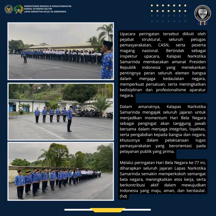 TIMELINES INEWS INVESTIGASI Samarinda, Kepala Lembaga Pemasyarakatan (Kalapas) Narkotika Samarinda memimpin pelaksanaan Upacara Peringatan Hari Bela Negara ke-77 yang digelar di Lapangan Lapas Narkotika Samarinda. Upacara ini mengusung tema “Teguhkan Bela Negara untuk Indonesia Maju”, sebagai wujud komitmen seluruh jajaran dalam menanamkan semangat nasionalisme, cinta tanah air, serta kesadaran bela negara dalam pelaksanaan tugas sehari-hari. Jumat (19/12)