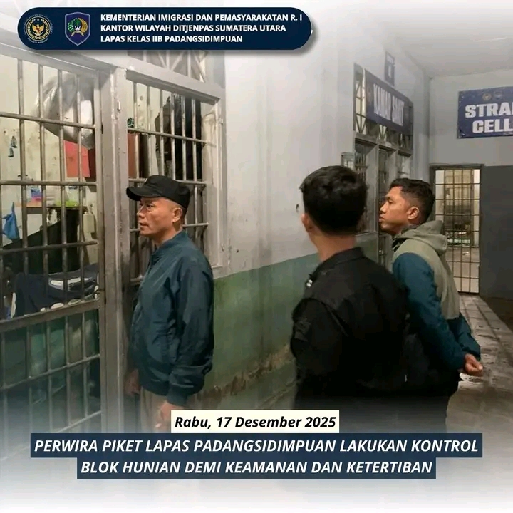 TIMELINES INEWS INVESTIGASI, Padangsidimpuan, Menjaga keamanan dan ketertiban di dalam lingkungan Lapas menjadi prioritas utama bagi petugas. Malam tadi, Perwira Piket Lapas Kelas IIB Padangsidimpuan, Denny Rio Sandi yang merupakan Kasubbag Tata Usaha melaksanakan kontrol menyeluruh ke blok hunian warga binaan sebagai bagian dari pengawasan rutin, Selasa malam (16/12/2025)