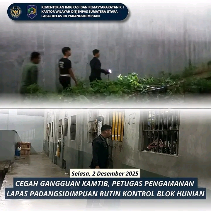 TIMELINES INEWS INVESTIGASI, Padangsidimpuan Untuk menjaga keamanan dan ketertiban secara menyeluruh di dalam Lapas, petugas pengamanan Lapas Kelas IIB Padangsidimpuan mulai menerapkan kontrol malam sebagai bagian dari rutinitas harian. Setiap malam, personel jaga melakukan serangkaian pemeriksaan kondisi warga binaan dan memastikan setiap gembok atau pintu blok hunian terkunci dengan baik, Selasa (2/12/2025)