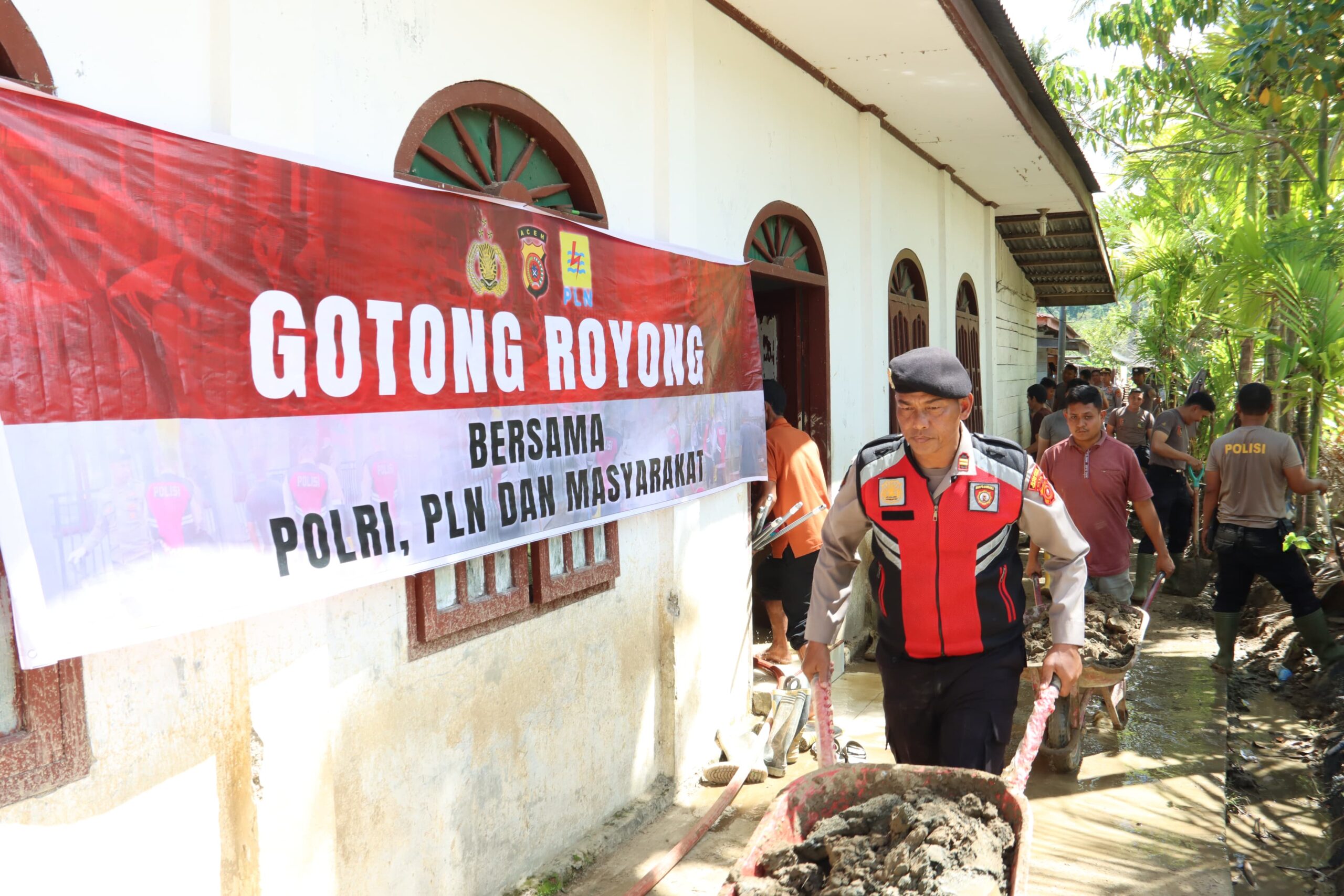 TLii | ACEH | GAYO LUES | RIKIT GAIB – Polisi bersama masyarakat melaksanakan kegiatan gotong royong di Masjid Cane Toa, Kecamatan Rikit Gaib, Kabupaten Gayo Lues, Sabtu (20/12/2025). Kegiatan ini menjadi upaya bersama dalam memulihkan semangat ibadah sekaligus mempererat kebersamaan warga di rumah ibadah.