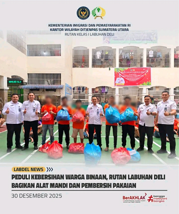 TIMELINES INEWS INVESTIGASI, Labuhan Deli Rumah Tahanan Negara (Rutan) Kelas I Labuhan Deli melaksanakan kegiatan pembagian alat mandi dan perlengkapan pembersih pakaian kepada seluruh Warga Binaan Pemasyarakatan (WBP), Selasa (30/12/2025). Kegiatan ini merupakan bagian dari upaya pemenuhan hak dasar warga binaan sekaligus peningkatan kebersihan dan kesehatan lingkungan hunian.