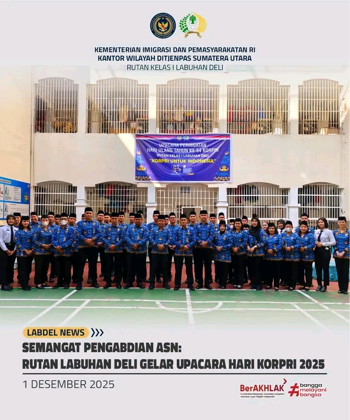 TIMELINES INEWS INVESTIGASI, Labuhan Deli Rumah Tahanan Negara (Rutan) Kelas I Labuhan Deli melaksanakan Upacara Peringatan Hari Korps Pegawai Republik Indonesia (Korpri) ke-54 pada Senin (1/12/2025). Upacara berlangsung khidmat di lapangan blok hunian Rutan dan diikuti oleh seluruh jajaran pejabat struktural, staf, regu pengamanan, serta pegawai magang sebagai bentuk penghormatan atas peran Korpri dalam mendukung tugas pemerintahan dan pelayanan publik.