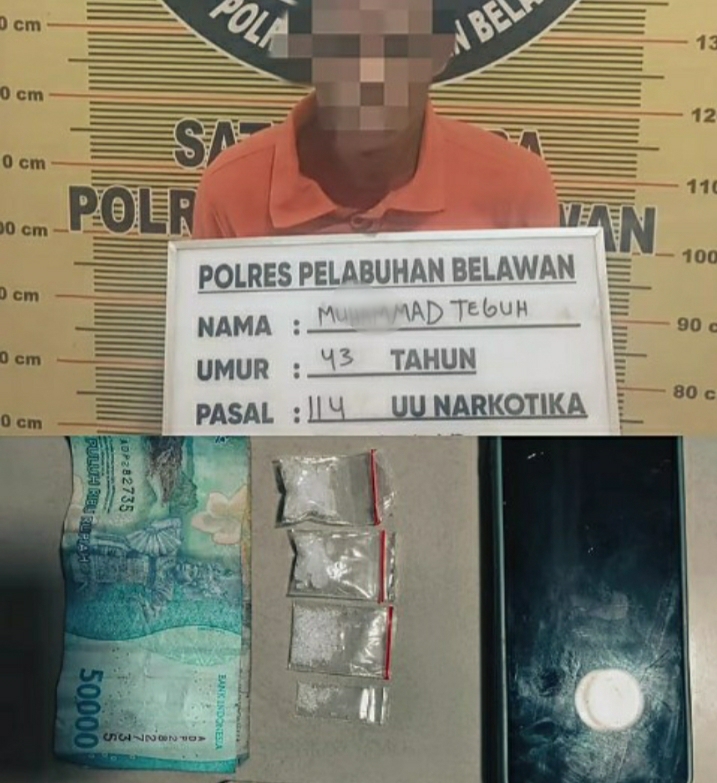 Tersangka yang diamankan berinisial Teguh (43). Dari tangan pelaku, petugas berhasil menyita barang bukti berupa 4 plastik klip berisi sabu, 1 buah pipet ujung runcing, 1 buah dompet warna emas, 1 unit handphone android, serta uang tunai Rp 70.000 yang diduga hasil transaksi.