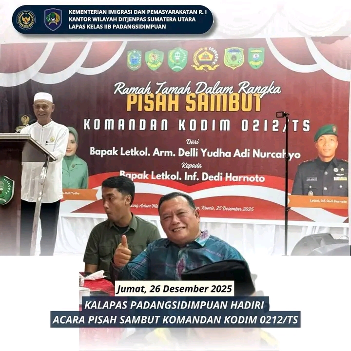 TIMELINES INEWS INVESTIGASI, Padangsidimpuan Kepala Lembaga Pemasyarakatan Kelas IIB Padangsidimpuan menghadiri acara pisah sambut Komandan Kodim 0212/Tapanuli Selatan yang berlangsung khidmat dan penuh kehangatan. Kegiatan tersebut menandai pergantian tampuk kepemimpinan dari Letkol Arm Delli Yudha Adi Nurcahyo kepada Letkol Inf Dedi Harnoto.