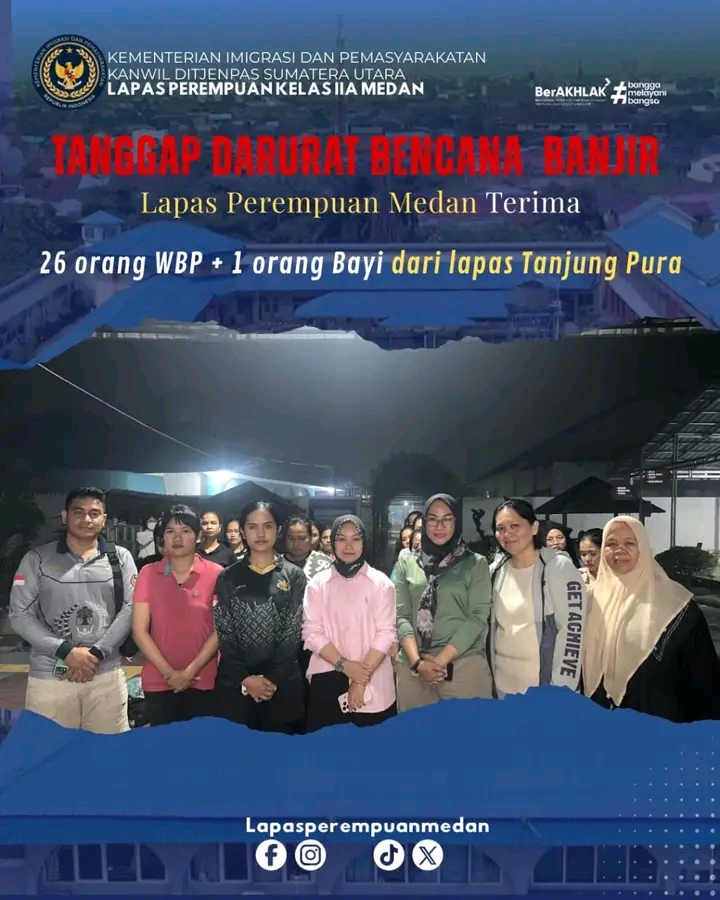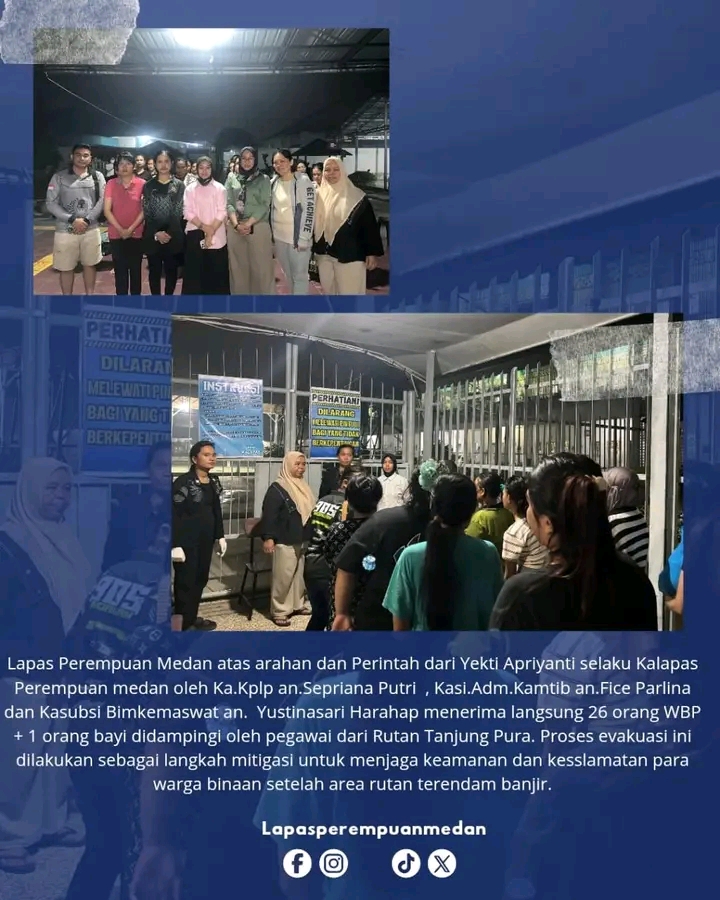 TIMELINES INEWS INVESTIGASI, Medan Lembaga Pemasyarakatan (Lapas) Perempuan Kelas IIA Medan pada Sabtu (30/11) menerima sebanyak 26 warga binaan pemasyarakatan (WBP) dan 1 orang bayi yang dievakuasi dari Rutan Tanjung Pura. Pemindahan ini dilakukan sebagai langkah darurat menyusul banjir besar yang melanda wilayah Kabupaten Langkat dan sekitarnya dalam beberapa hari terakhir.