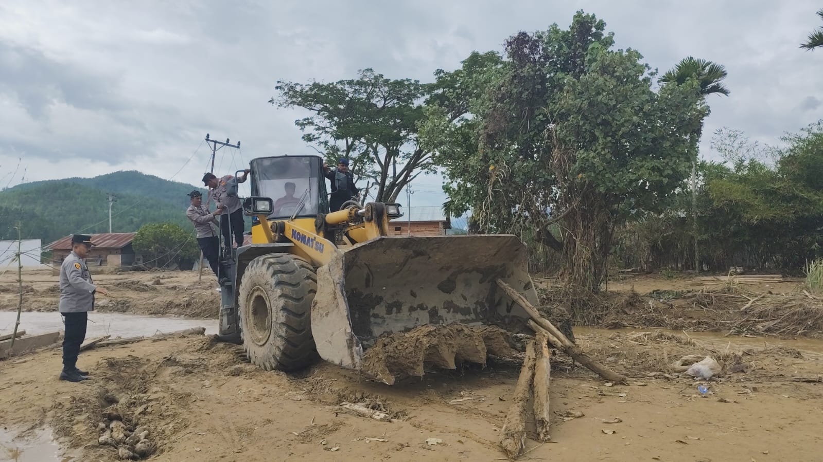 “Loader hanya mampu memindahkan material lumpur, sementara gelondongan kayu besar menjadi kendala utama dalam proses lanjutan pembukaan jalan,” jelasnya.