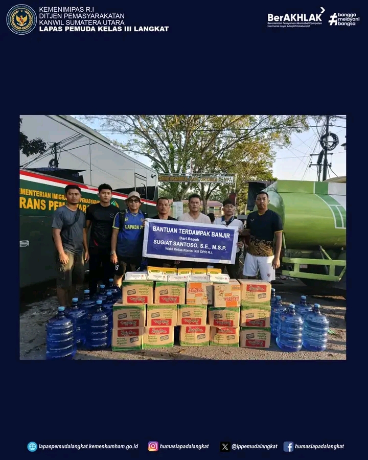 TIMELINES INEWS INVESTIGASI, Langkat Di tengah duka akibat banjir yang melanda sebagian wilayah Langkat, secercah harapan hadir berkat kepedulian Wakil Ketua Komisi XIII DPR RI, Sugiat Santoso. Beliau menggandeng Lapas Pemuda Langkat untuk menyalurkan bantuan langsung kepada warga binaan dan masyarakat Desa Cempa yang terdampak banjir, Minggu (30/11/2025).