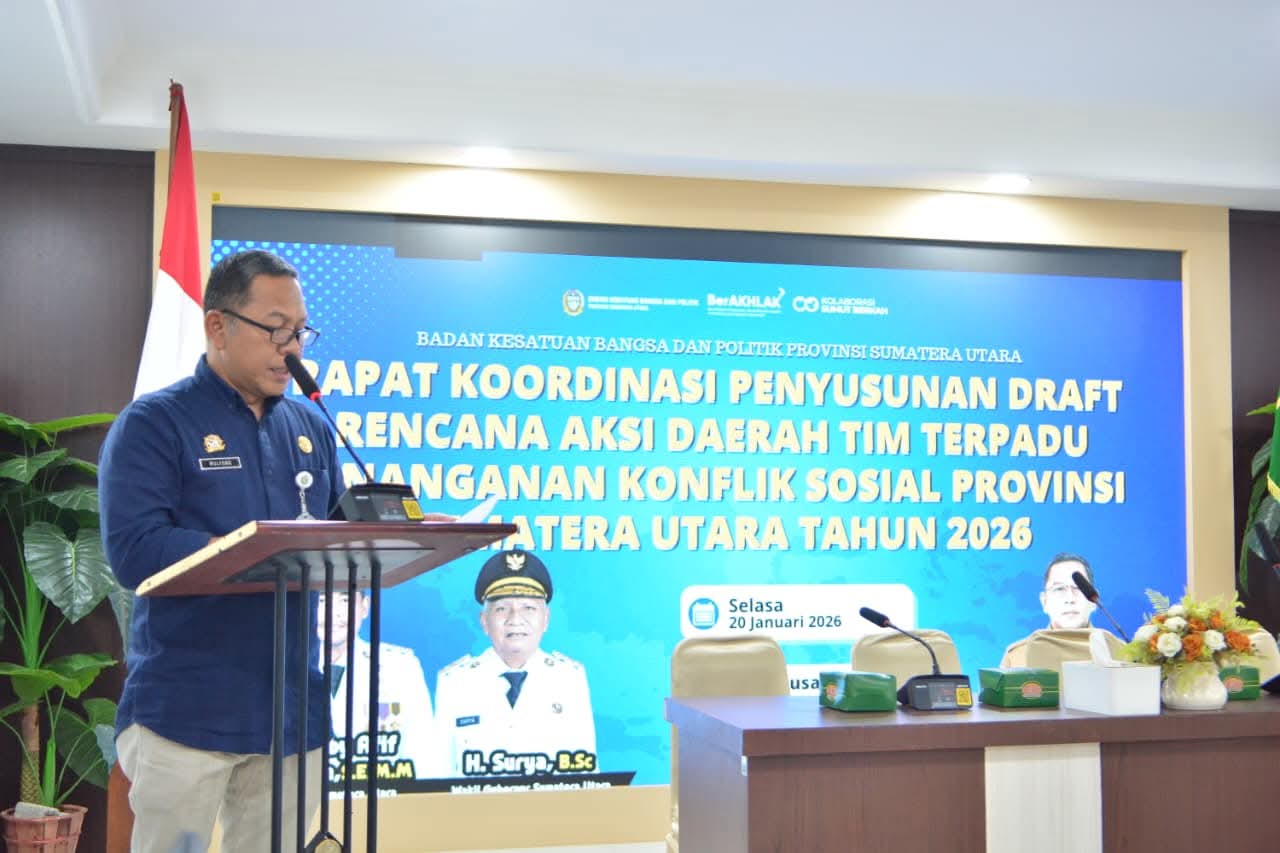 TIMELINES INEWS INVESTIGASI, Medan Menjaga kondusivitas wilayah di Sumatera Utara memerlukan langkah konkret yang menyentuh hingga ke pelosok desa. Hal ini ditegaskan dalam Rapat Koordinasi Penyusunan Draft Rencana Aksi Daerah (RAD) Tim Terpadu Penanganan Konflik Sosial Provinsi Sumatera Utara Tahun 2026 yang digelar di Aula Nusantara Kesbangpol Sumut, Selasa (20/01).