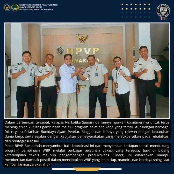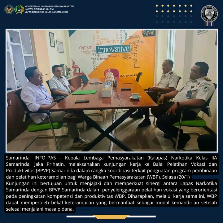 TIMELINES INEWS INVESTIGASI, Samarinda, Kepala Lembaga Pemasyarakatan (Kalapas) Narkotika Kelas IIA Samarinda, Jaka Prihatin, melaksanakan kunjungan kerja ke Balai Pelatihan Vokasi dan Produktivitas (BPVP) Samarinda dalam rangka koordinasi terkait penguatan program pembinaan dan pelatihan keterampilan bagi Warga Binaan Pemasyarakatan (WBP), Selasa (20/1)