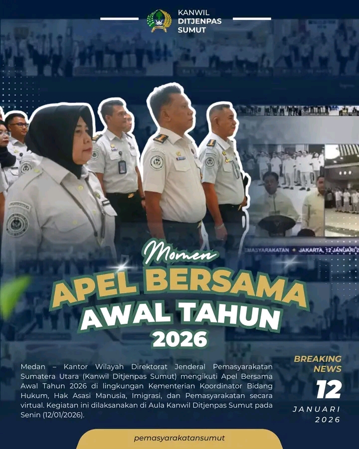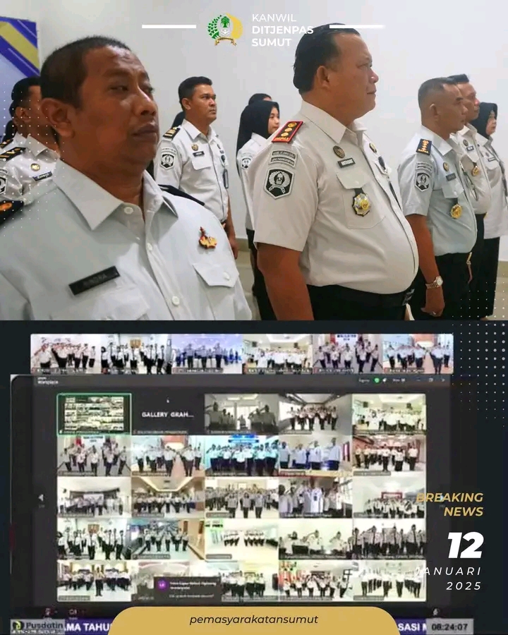 TIMELINES INEWS INVESTIGASI, Medan Kantor Wilayah Direktorat Jenderal Pemasyarakatan Sumatera Utara (Kanwil Ditjenpas Sumut) mengikuti Apel Bersama Awal Tahun 2026 di lingkungan Kementerian Koordinator Bidang Hukum, Hak Asasi Manusia, Imigrasi, dan Pemasyarakatan secara virtual. Kegiatan ini dilaksanakan di Aula Kanwil Ditjenpas Sumut pada Senin (12/01/2026).