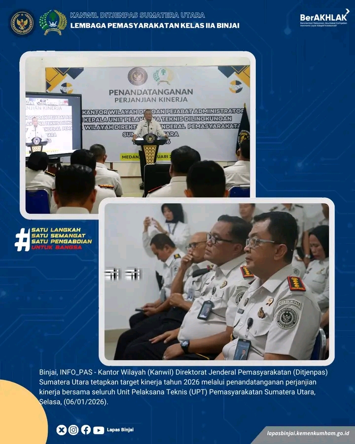 TIMELINES INEWS INVESTIGASI, Binjai Kantor Wilayah Direktorat Jenderal Pemasyarakatan (Kanwil Ditjenpas) Sumatera Utara menetapkan target kinerja tahun 2026 melalui penandatanganan Perjanjian Kinerja bersama seluruh Unit Pelaksana Teknis (UPT) Pemasyarakatan se-Sumatera Utara. Kegiatan ini digelar di Aula Kanwil Ditjenpas Sumut pada Selasa (06/01/2026).