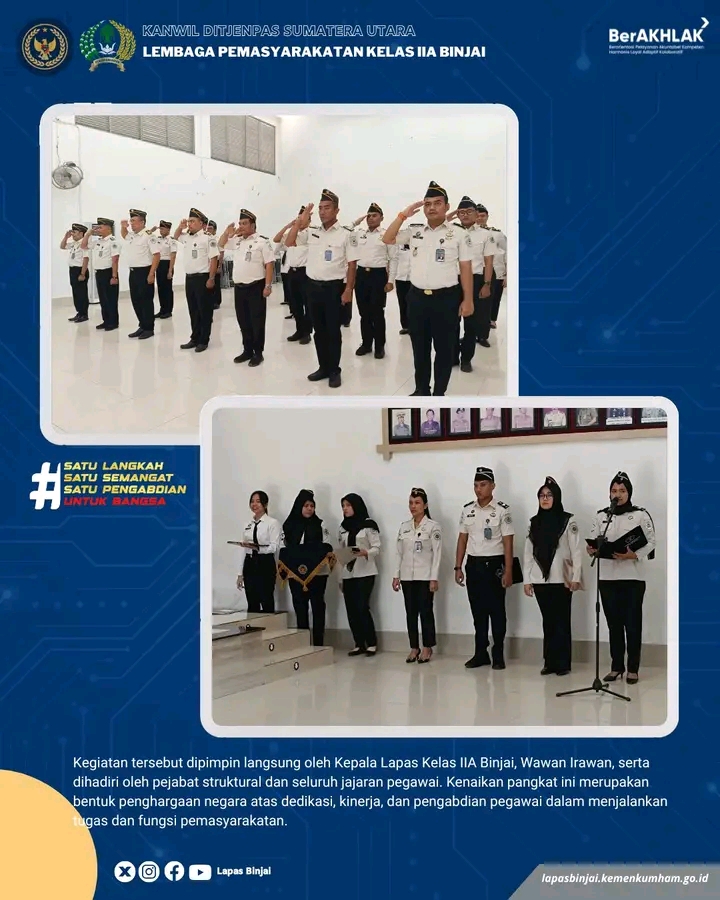 Kegiatan dipimpin langsung oleh Kepala Lapas Kelas IIA Binjai, Wawan Irawan, serta dihadiri oleh pejabat struktural dan seluruh jajaran pegawai. Kenaikan pangkat ini merupakan bentuk penghargaan negara atas dedikasi, kinerja, serta pengabdian pegawai dalam menjalankan tugas dan fungsi pemasyarakatan.