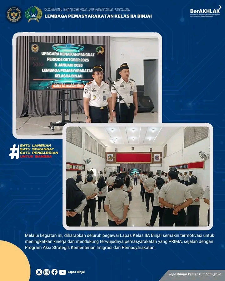 TIMELINES INEWS INVESTIGASI, Binjai Lembaga Pemasyarakatan (Lapas) Kelas IIA Binjai melaksanakan kegiatan penyematan dan penyerahan Surat Keputusan (SK) Kenaikan Pangkat bagi pegawai periode 1 Oktober 2025 dan 1 Januari 2026. Kegiatan tersebut berlangsung di Aula Lapas Kelas IIA Binjai, Rabu (14/01/2026).