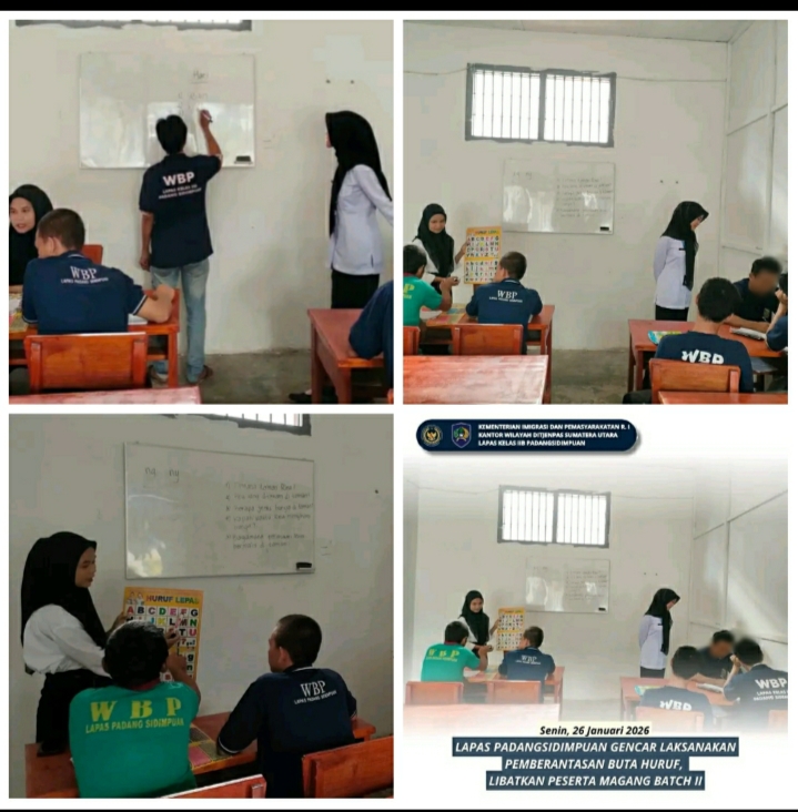 TIMELINES INEWS INVESTIGASI, Padangsidimpuan Lembaga Pemasyarakatan (Lapas) Kelas IIB Padangsidimpuan terus menunjukkan komitmennya dalam meningkatkan kualitas pembinaan kepribadian warga binaan melalui program pemberantasan buta huruf. Kegiatan ini dilaksanakan secara rutin dan melibatkan peserta magang Batch II sebagai tenaga pengajar.