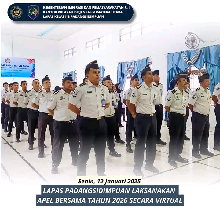 TIMELINES INEWS INVESTIGASI, Padangsidimpuan Lembaga Pemasyarakatan (Lapas) Kelas IIB Padangsidimpuan melaksanakan Apel Bersama Tahun 2026 di lingkungan Kementerian Koordinator Bidang Hukum, Hak Asasi Manusia, Imigrasi, dan Pemasyarakatan (Kemenko Hukum, HAM, Imigrasi, dan Pemasyarakatan), yang digelar secara virtual pada Senin (12/1/2026).