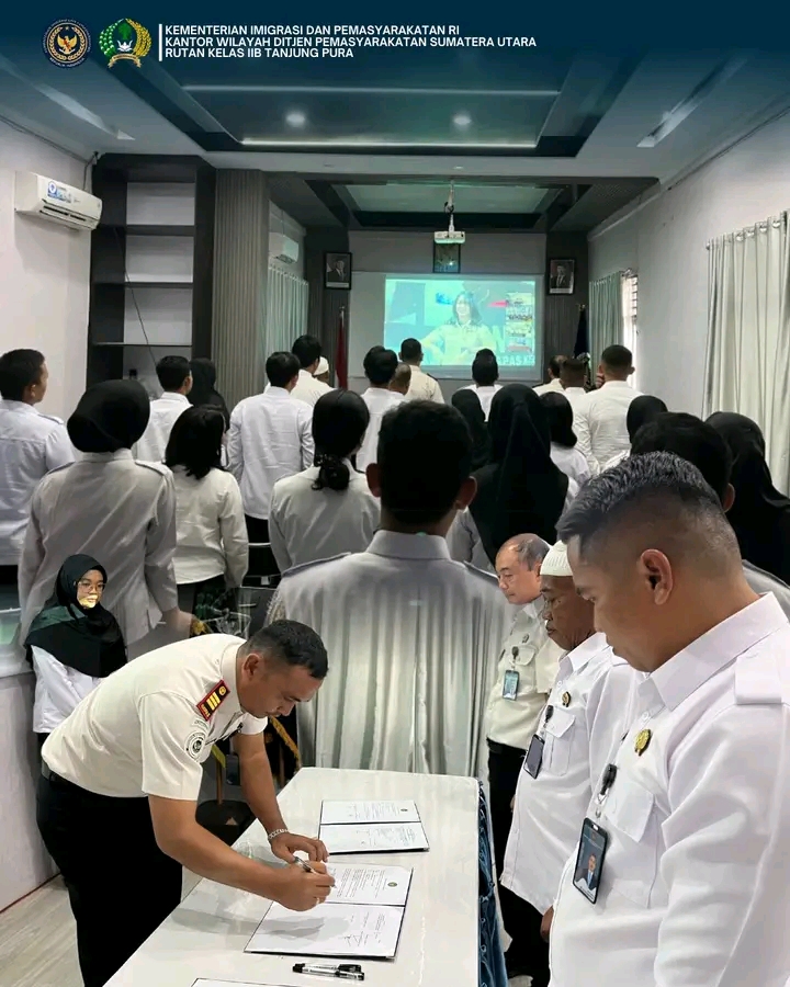 TIMELINES INEWS INVESTIGASI, Tanjung Pura Rumah Tahanan Negara Kelas IIB Tanjung Pura Kantor Wilayah Direktorat Jenderal Pemasyarakatan mengikuti apel bersama pegawai awal tahun 2026 yang dilaksanakan Kementerian Imigrasi dan Pemasyarakatan secara virtual. Senin (05/01/26)