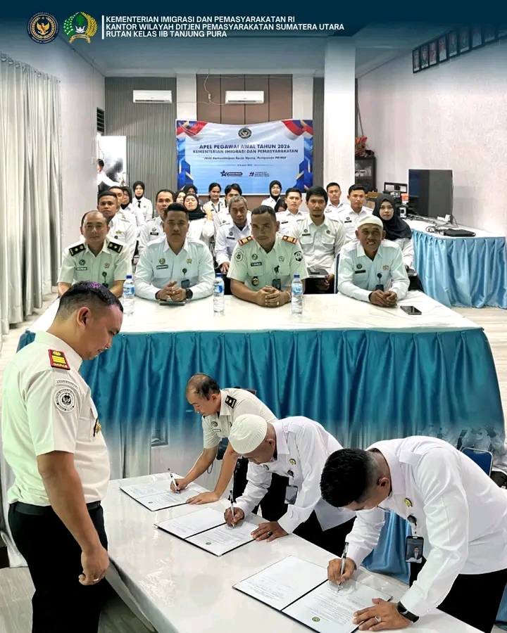 Kegiatan ini diikuti oleh Karutan Tanjung Pura, Fransisco Pandia bersama pejabat struktural dan jajaran di Aula Rutan Tanjung Pura secara khidmat dan penuh semangat menyongsong tahun kerja 2026. Apel ini menjadi momen penting dalam penguatan komitmen serta semangat pegawai dalam melaksanakan tugas di tahun ini. Mengusung tema “ 2026 Kemenimipas Kerja Nyata, Pelayanan PRIMA” menjadi cerminan bersama dalam memberikan pelayanan publik yang semakin optimal.