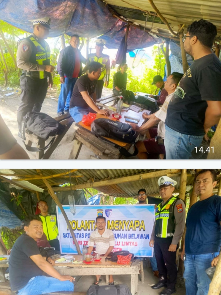 TIMELINES INEWS INVESTIGASI, Belawan Satuan Lalu Lintas (Sat Lantas) Polres Pelabuhan Belawan melaksanakan kegiatan Polantas Menyapa dengan memberikan sosialisasi keamanan, keselamatan, ketertiban, dan kelancaran lalu lintas (kamseltibcar lantas) kepada masyarakat di warung kopi Jalan Raya Pelabuhan, Kelurahan Bagan Deli, Kecamatan Medan Belawan, Kamis (15/01/2026).