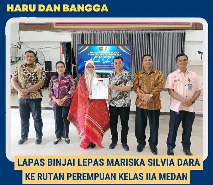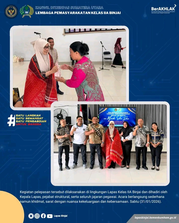 TIMELINES INEWS INVESTIGASI, Binjai Suasana haru dan penuh kebanggaan mewarnai kegiatan pelepasan Kepala Urusan Kepegawaian dan Keuangan Lembaga Pemasyarakatan (Lapas) Kelas IIA Binjai, Mariska Silvia Dara, yang mendapat amanah baru sebagai Kepala Sub Seksi Pengelolaan Rumah Tahanan Negara (Rutan) Perempuan Kelas IIA Medan. Kegiatan tersebut dilaksanakan di lingkungan Lapas Kelas IIA Binjai, Sabtu (31/01/2026).