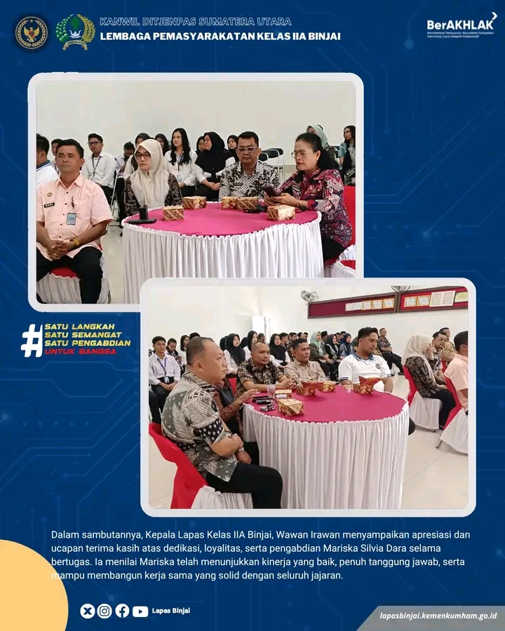 Dalam sambutannya, Kepala Lapas Kelas IIA Binjai, Wawan Irawan, menyampaikan apresiasi dan ucapan terima kasih atas dedikasi, loyalitas, dan pengabdian yang telah diberikan Mariska Silvia Dara selama menjalankan tugas di Lapas Binjai. Ia menilai Mariska telah menunjukkan kinerja yang baik, penuh tanggung jawab, serta mampu membangun kerja sama yang solid dengan seluruh jajaran.