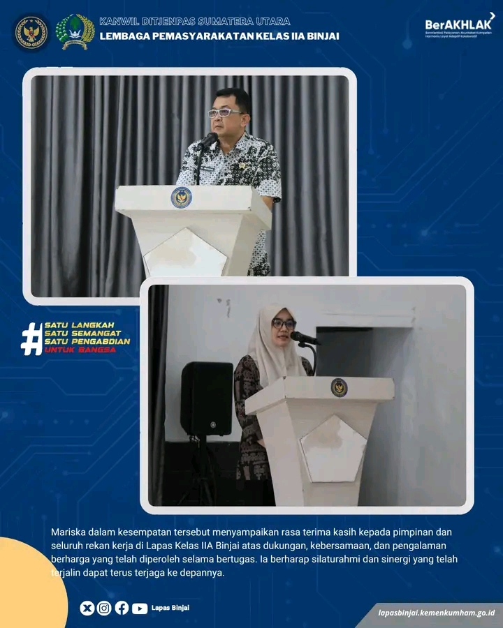 Sementara itu, Mariska Silvia Dara dalam sambutannya menyampaikan rasa terima kasih kepada pimpinan dan seluruh rekan kerja di Lapas Kelas IIA Binjai atas dukungan, kebersamaan, serta pengalaman berharga selama bertugas. Ia berharap silaturahmi dan sinergi yang telah terjalin dapat terus terjaga ke depannya.