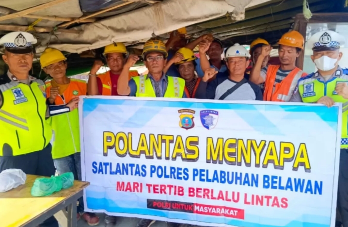 Kapolres Pelabuhan Belawan, AKBP Rosef Efendi, S.I.K., M.H., CPHR., melalui Kasat Lantas AKP Andi K. Barus, S.H., M.H., menyampaikan bahwa dalam kegiatan tersebut personel Sat Lantas memberikan edukasi secara langsung kepada para buruh bongkar muat terkait pentingnya keselamatan berlalu lintas.