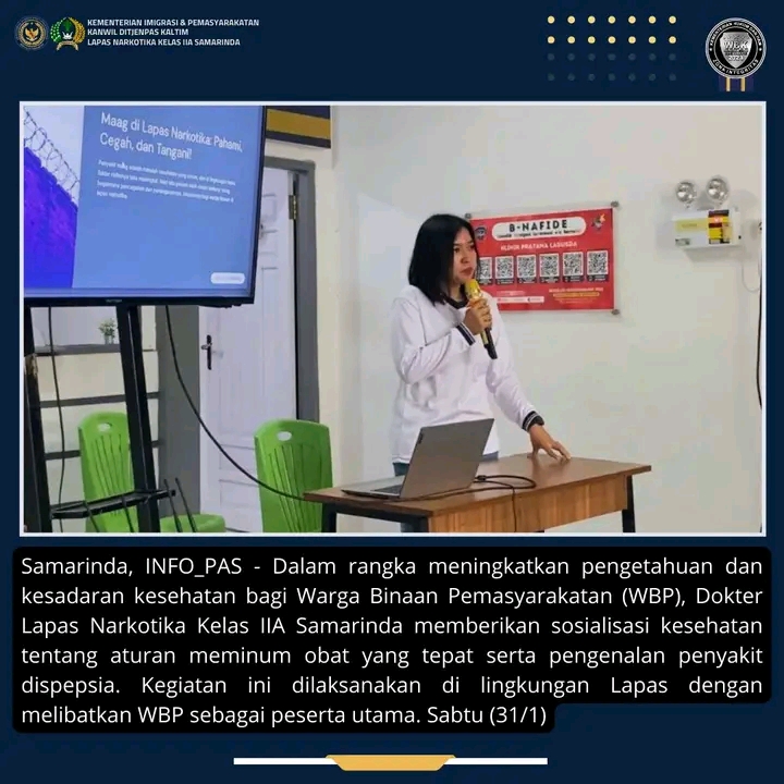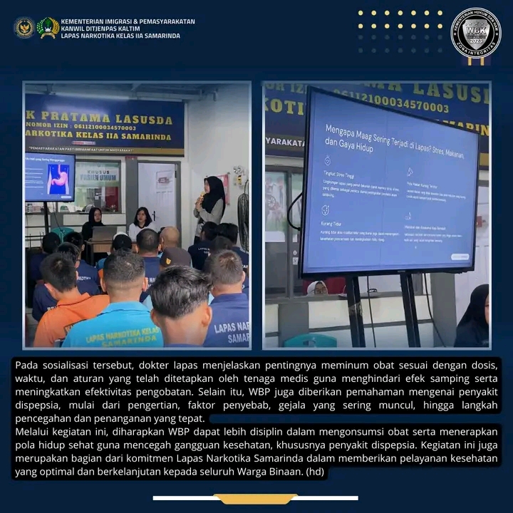 TIMELINES INEWS INVESTIGASI, Samarinda, Dalam rangka meningkatkan pengetahuan dan kesadaran kesehatan bagi Warga Binaan Pemasyarakatan (WBP), Dokter Lapas Narkotika Kelas IIA Samarinda memberikan sosialisasi kesehatan tentang aturan meminum obat yang tepat serta pengenalan penyakit dispepsia. Kegiatan ini dilaksanakan di lingkungan Lapas dengan melibatkan WBP sebagai peserta utama. Sabtu (31/1)