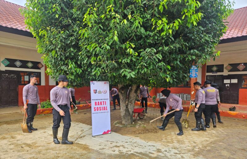 Timelineinews.com [] Meureudu – Mahasiswa DIANMAS STIK/PTIK Lemdiklat Polri Angkatan 83/Widya Pratama Satwika (WPS) bersama Polres Pidie Jaya dan masyarakat menggelar gotong royong membersihkan fasilitas pendidikan terdampak banjir, Kamis (12/2/2026).