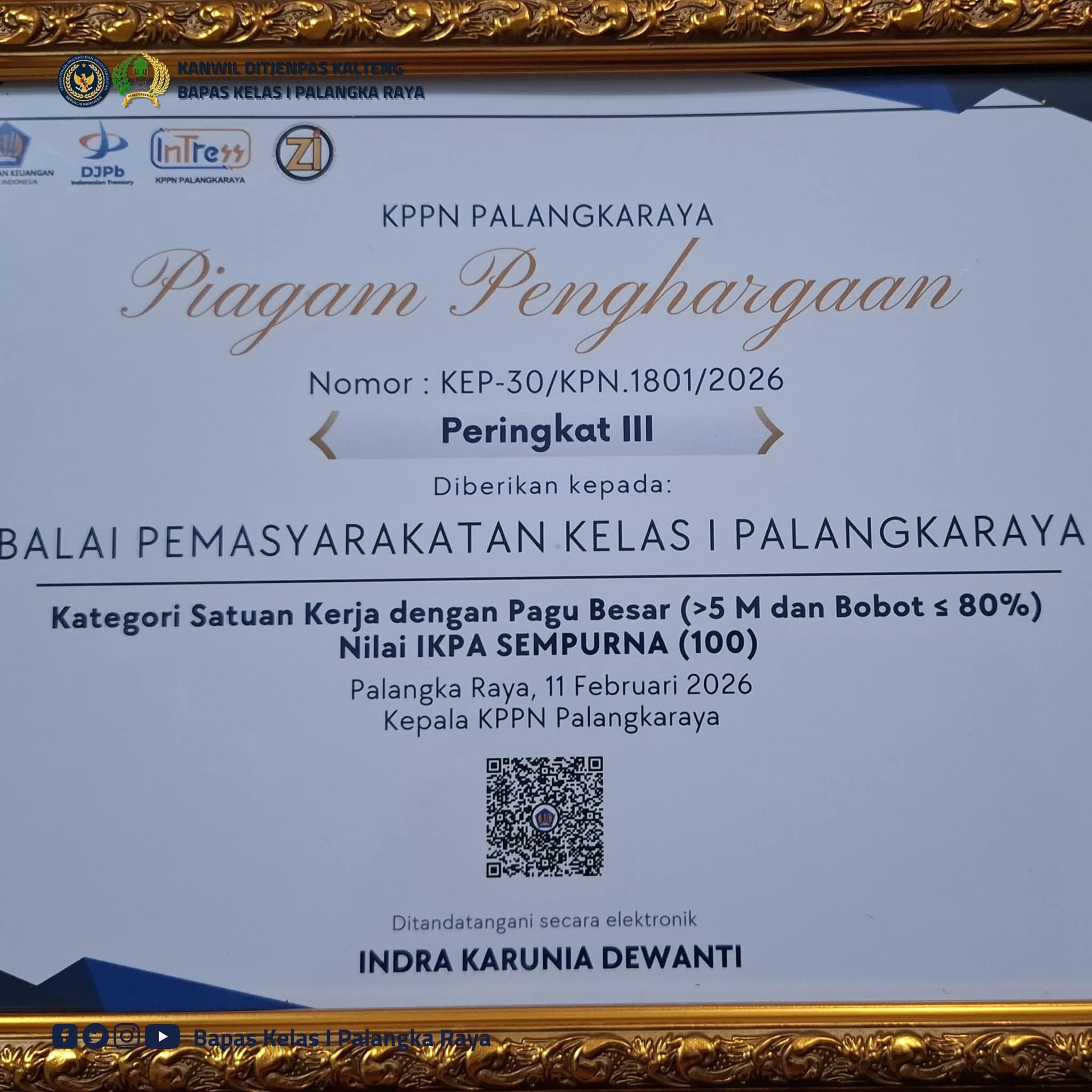 Pada kesempatan tersebut, Bapas Kelas I Palangka Raya berhasil meraih penghargaan dalam kategori Satker dengan Pagu Besar (>5 Miliar dan Bobot ≤ 80%) dengan Nilai Indikator Kinerja Pelaksanaan Anggaran (IKPA) Sempurna, yakni 100, Tahun 2026.