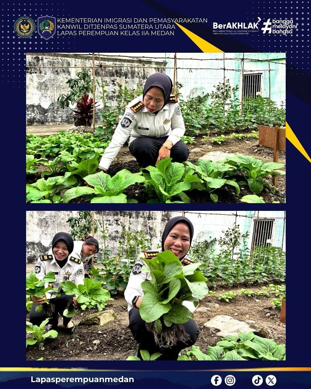 Suasana penuh semangat tampak saat jajaran pimpinan turut serta melakukan panen sayur sawi manis yang tumbuh subur di lahan branggang. Program pertanian tersebut merupakan bagian dari pembinaan kemandirian warga binaan dengan memanfaatkan lahan terbatas menjadi area yang produktif dan bernilai guna.