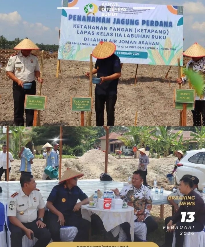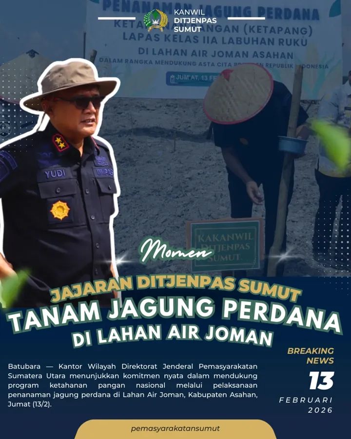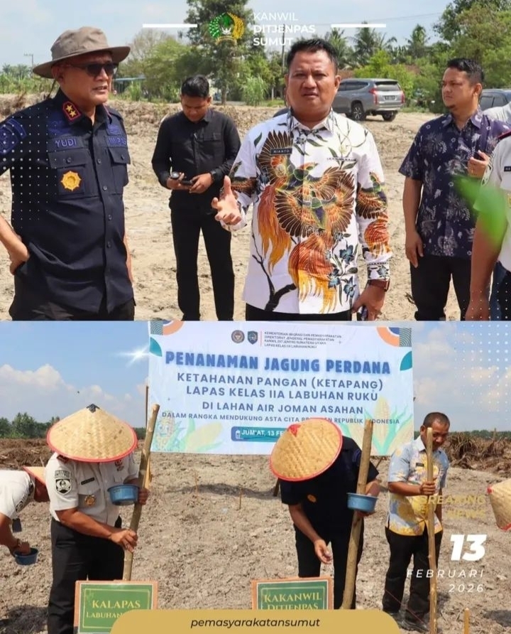 TIMELINES INEWS INVESTIGASI, Batubara Kantor Wilayah Direktorat Jenderal Pemasyarakatan Sumatera Utara menunjukkan komitmen nyata dalam mendukung program ketahanan pangan nasional melalui pelaksanaan penanaman jagung perdana di Lahan Air Joman, Kabupaten Asahan, Jumat (13/2).