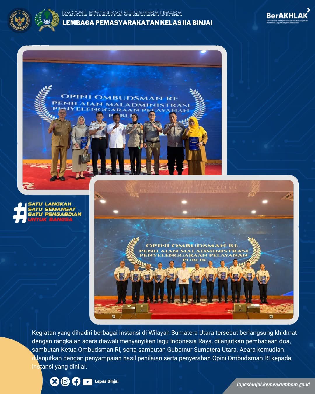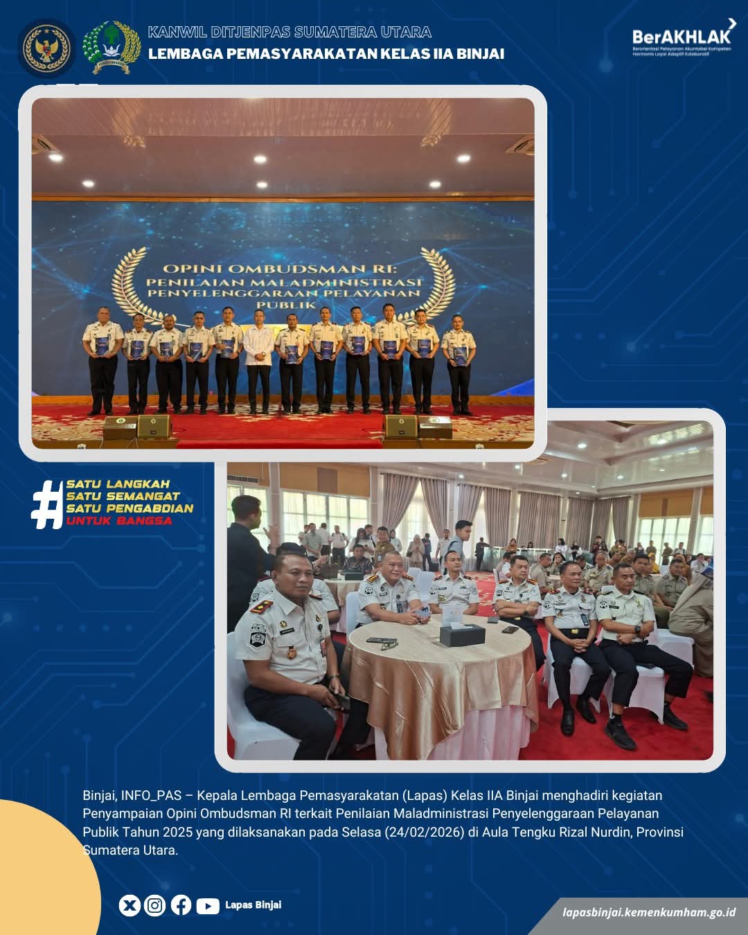 TIMELINES INEWS INVESTIGASI, Binjai Kepala Lembaga Pemasyarakatan Kelas IIA Binjai menghadiri kegiatan Penyampaian Opini Ombudsman RI terkait Penilaian Maladministrasi Penyelenggaraan Pelayanan Publik Tahun 2025 yang dilaksanakan pada Selasa (24/02/2026) di Aula Tengku Rizal Nurdin, Provinsi Sumatera Utara.