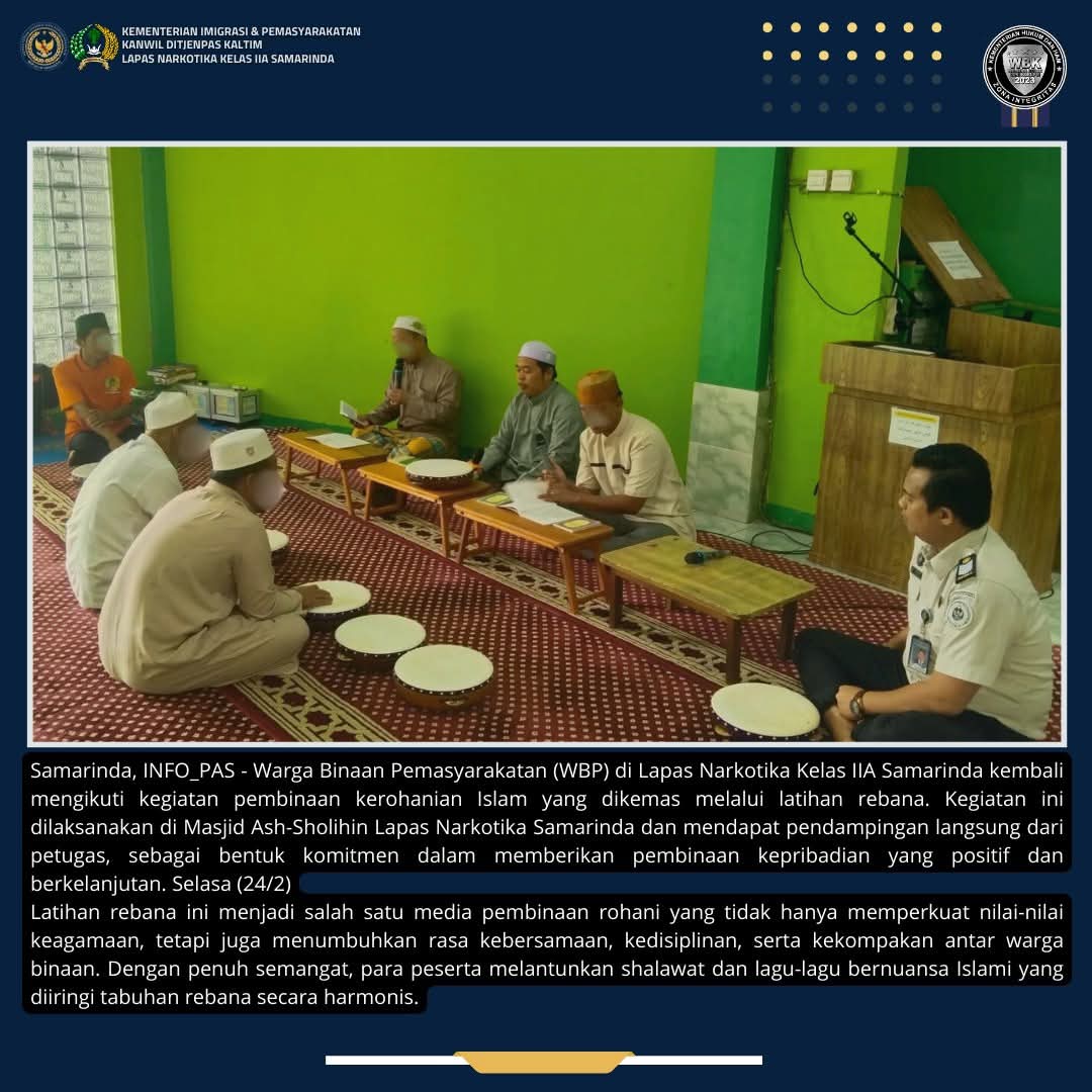 TIMELINES INEWS INVESTIGASI, Samarinda,Warga Binaan Pemasyarakatan (WBP) di Lapas Narkotika Kelas IIA Samarinda kembali mengikuti kegiatan pembinaan kerohanian Islam yang dikemas melalui latihan rebana. Kegiatan ini dilaksanakan di Masjid Ash-Sholihin Lapas Narkotika Samarinda dan mendapat pendampingan langsung dari petugas, sebagai bentuk komitmen dalam memberikan pembinaan kepribadian yang positif dan berkelanjutan. Selasa (24/2)