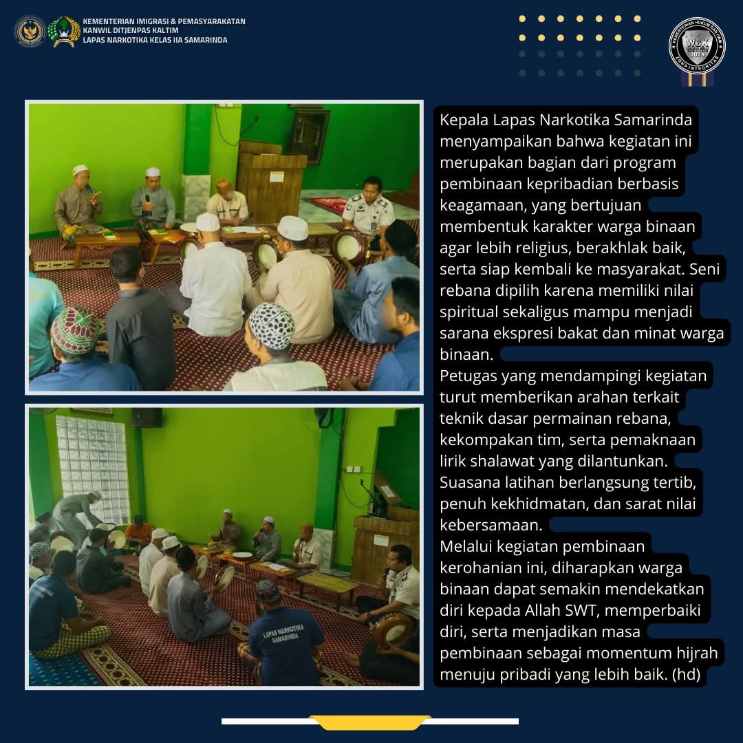 Kepala Lapas Narkotika Samarinda menyampaikan bahwa kegiatan ini merupakan bagian dari program pembinaan kepribadian berbasis keagamaan, yang bertujuan membentuk karakter warga binaan agar lebih religius, berakhlak baik, serta siap kembali ke masyarakat. Seni rebana dipilih karena memiliki nilai spiritual sekaligus mampu menjadi sarana ekspresi bakat dan minat warga binaan.