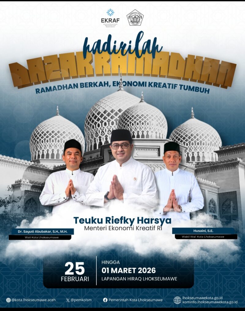 TLii|Aceh|Lhokseumawe, 24 Februari 2026 — Pemerintah Kota Lhokseumawe kembali menunjukkan komitmennya dalam mendorong pertumbuhan Usaha Mikro, Kecil, dan Menengah (UMKM) melalui penyelenggaraan Bazar Ramadhan 2026. Kegiatan ini dipusatkan di Lapangan Hiraq dan berlangsung mulai 25 Februari hingga 1 Maret 2026, mengusung tema “Ramadhan Berkah, Ekonomi Kreatif Tumbuh.”