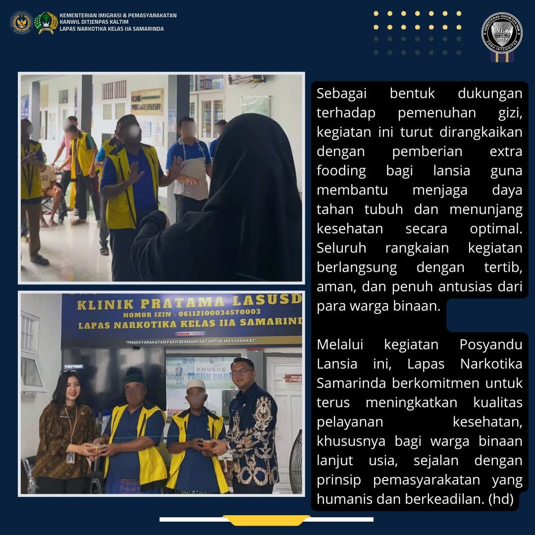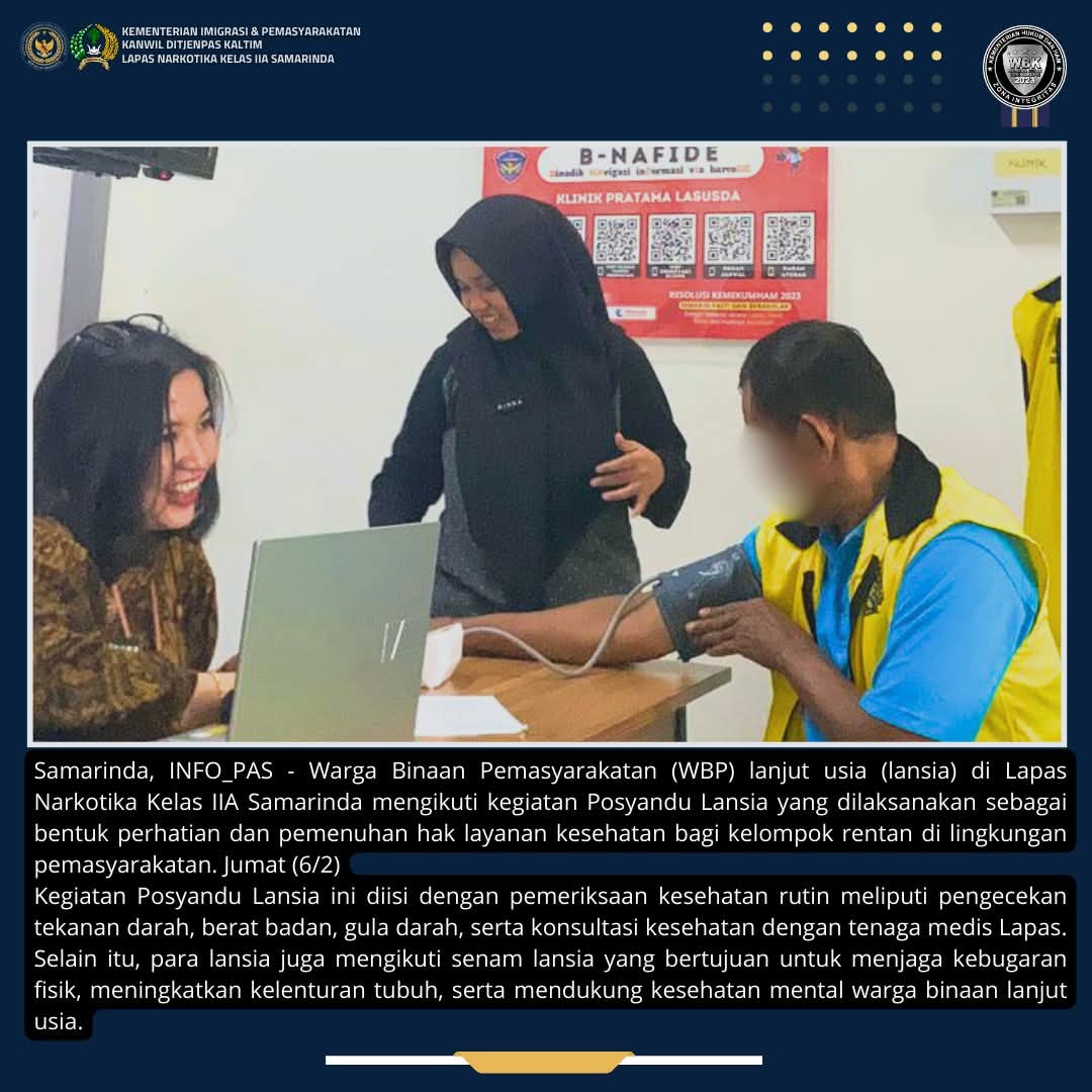 Melalui kegiatan Posyandu Lansia ini, Lapas Narkotika Samarinda berkomitmen untuk terus meningkatkan kualitas pelayanan kesehatan, khususnya bagi warga binaan lanjut usia, sejalan dengan prinsip pemasyarakatan yang humanis dan berkeadilan,Terangnya