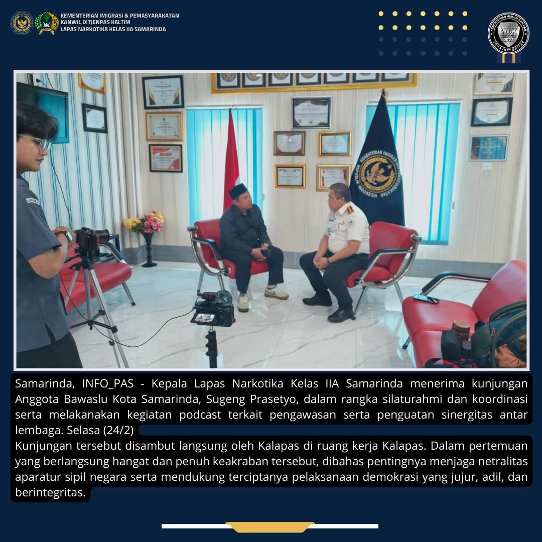 TIMELINES INEWS INVESTIGASI, Samarinda, Kepala Lapas Narkotika Kelas IIA Samarinda menerima kunjungan Anggota Bawaslu Kota Samarinda, Sugeng Prasetyo, dalam rangka silaturahmi dan koordinasi serta melakanakan kegiatan podcast terkait pengawasan serta penguatan sinergitas antar lembaga. Selasa (24/2)