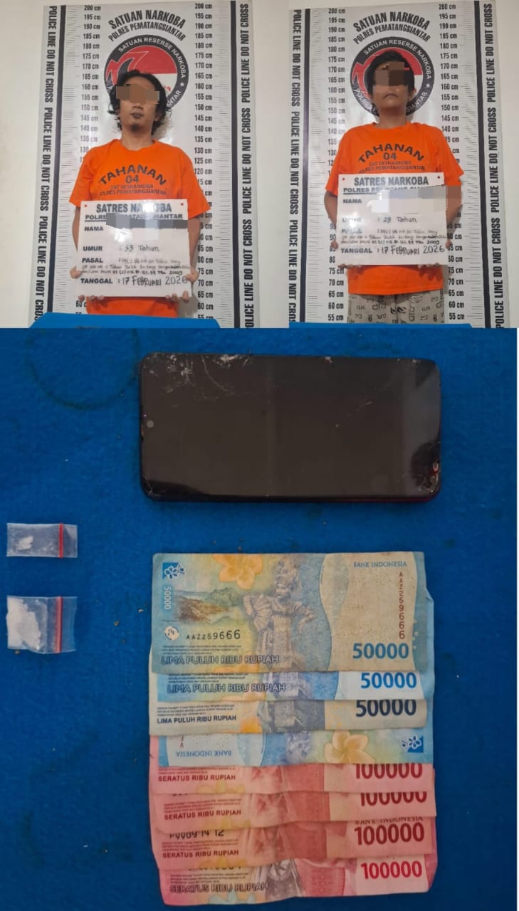 Dua orang laki laki ditangkap inisial MWV (30) warga Jalan Rakutta Sembiring Gang Baja Kelurahan Pondok Sayur Kecamatan Siantar Martoba Kota Pematangsiantar dan AD (36) warga Komplek Asrama Martoba Jalan Rakutta Sembiring Kelurahan Nagapita Kecamatan Siantar Martoba Kota Pematangsiantar.